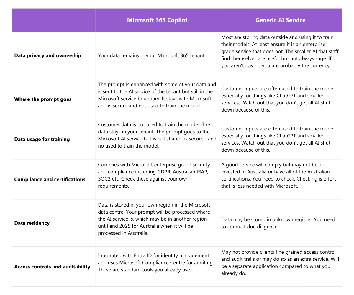 First, recognise that people are the problem not AI. People use the wrong AI for the job. But which AI should they use instead? The obvious answer is to use a service that is secure but how do you work this out? The table below will help you decide if the AI service you are using is the right one, specifically comparing Microsoft 365 Copilot to other services.