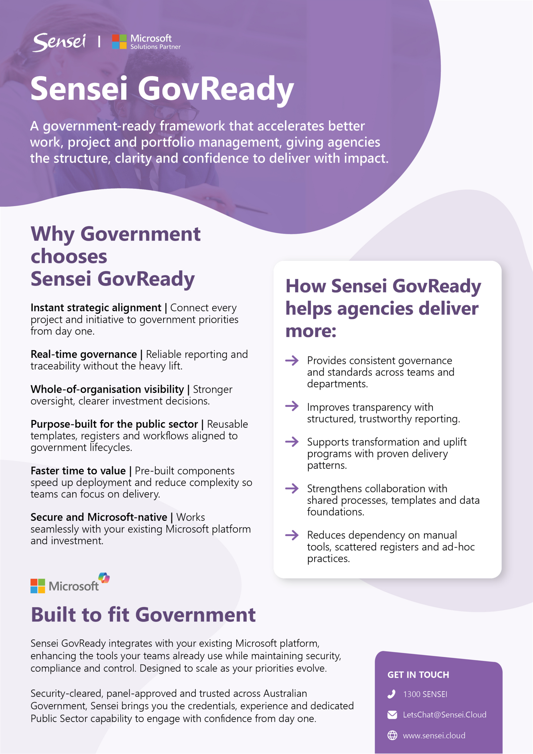 Sensei GovReady enables Australian Government agencies to deliver the critical programs of work for their communities with transparency, assurance and confidence. Aligned to government digital strategies of the future.Â